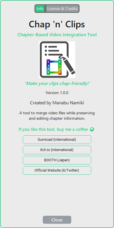 | Tags | chapters, clips, ffmpeg, lossless, productivity, tool, utility, video-editing, video-joiner, video-merger |